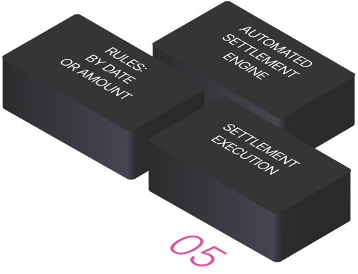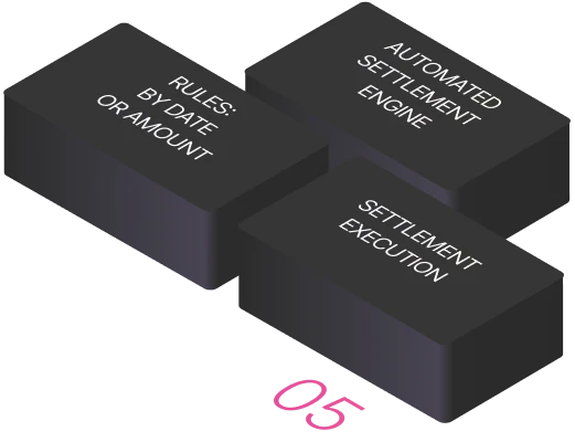 Settle funds automatically by date or amount. Run mass payouts and predictable fund distribution.